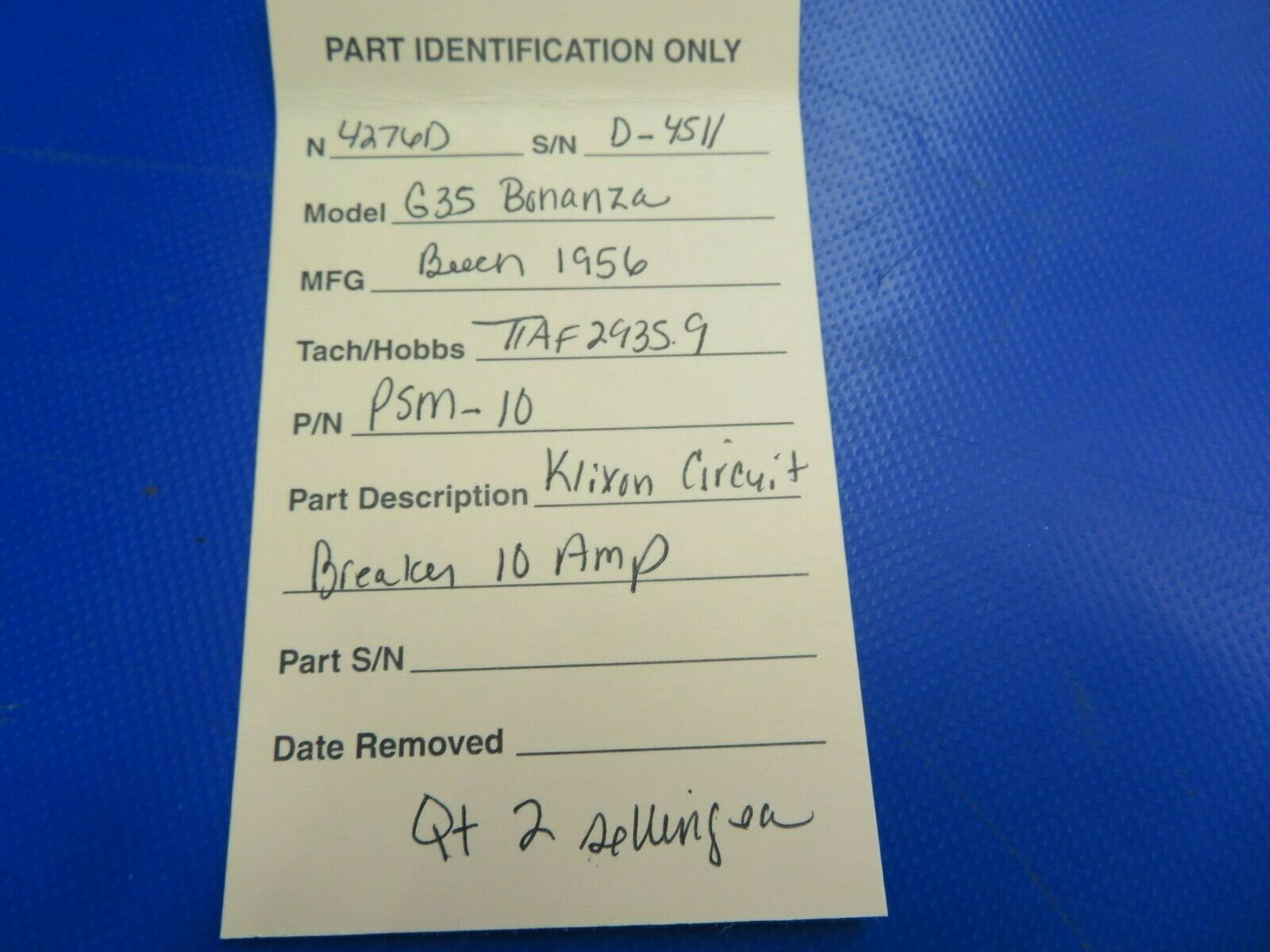 Beech G35 Bonanza Klixon Circuit Breaker 10 Amp. P/N PSM-10. Removed in good condition from a parted out 1956 Beech G35 Bonanza N4276D, S/N D-4511. TTAF 2935.9. Guaranteed to pass inspection or your money back.