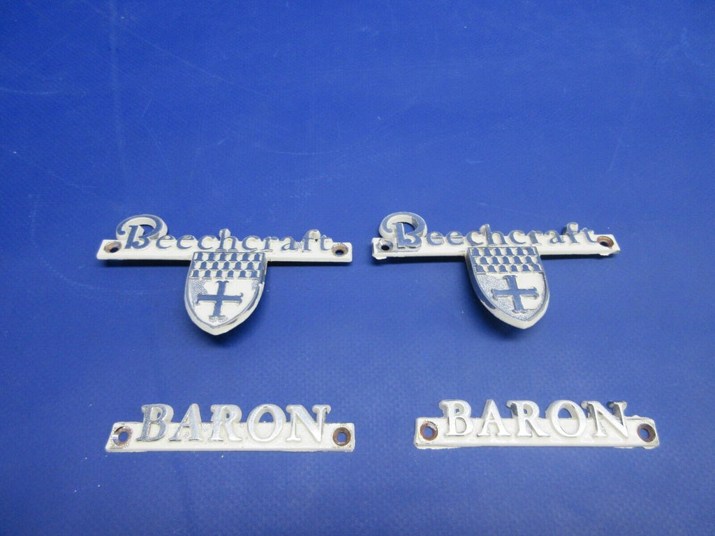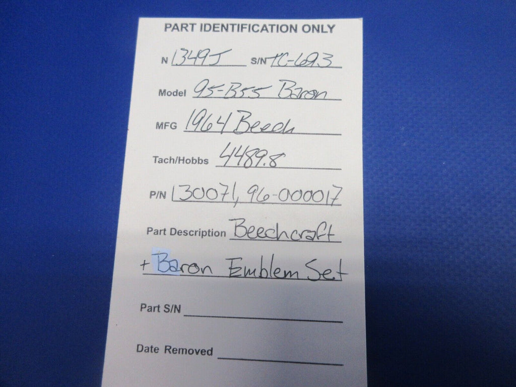 Beech 95-B55 Baron Beechcraft Emblem Set. P/N 130071, 96-000017. Removed in good condition from a parted out 1964 Beech 95-B55 Baron N1349J, S/N TC-693. TTAF 4,489.8. Guaranteed to pass inspection or your money back.