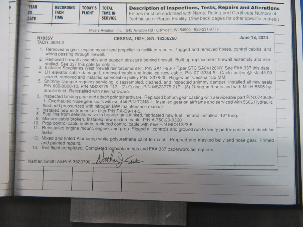 Cessna 182 Fuselage. 1965 Cessna 182H N1935V, S/N 18256260. TTAF 3,842.2. Was flipped on back in a windstorm. No significant damage to the fuselage. Firewall is in nice condition. On June 18, 2024 the Seaplanes West firewall reinforcement kit was installed. See photos.