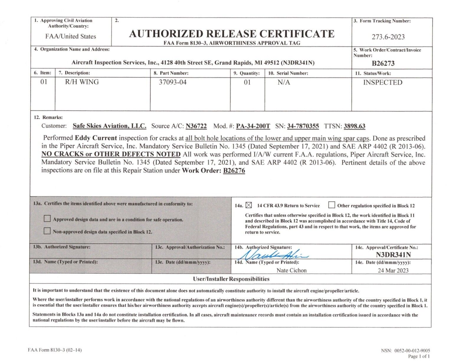 Piper PA-34-200T Right Hand Wing with Fuel Tank. P/N 37093-04. Removed from parted out 1971 Piper PA-34-200T N36722, S/N 34-7870355. Aircraft TT 3898.63. Spar passed Eddy Current inspection per Piper Mandatory Service Bulletin No. 1345A (Dated September 17, 2021) and SAE ARP 4402 (R 2013-06). 8130 included.