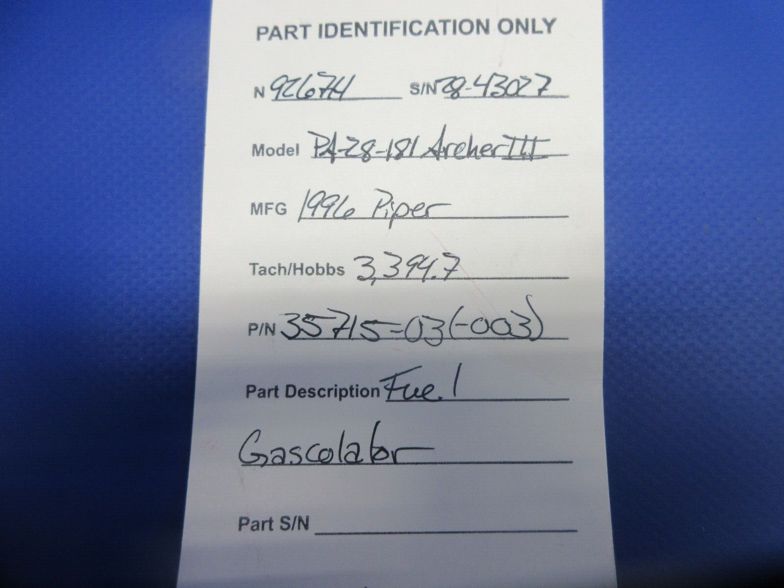 Removed in good condition from a parted out 1996 Piper PA-28-181 Archer III N9267H, S/N 28-43027. TTAF 3,394.7. Guaranteed to pass inspection or your money back.