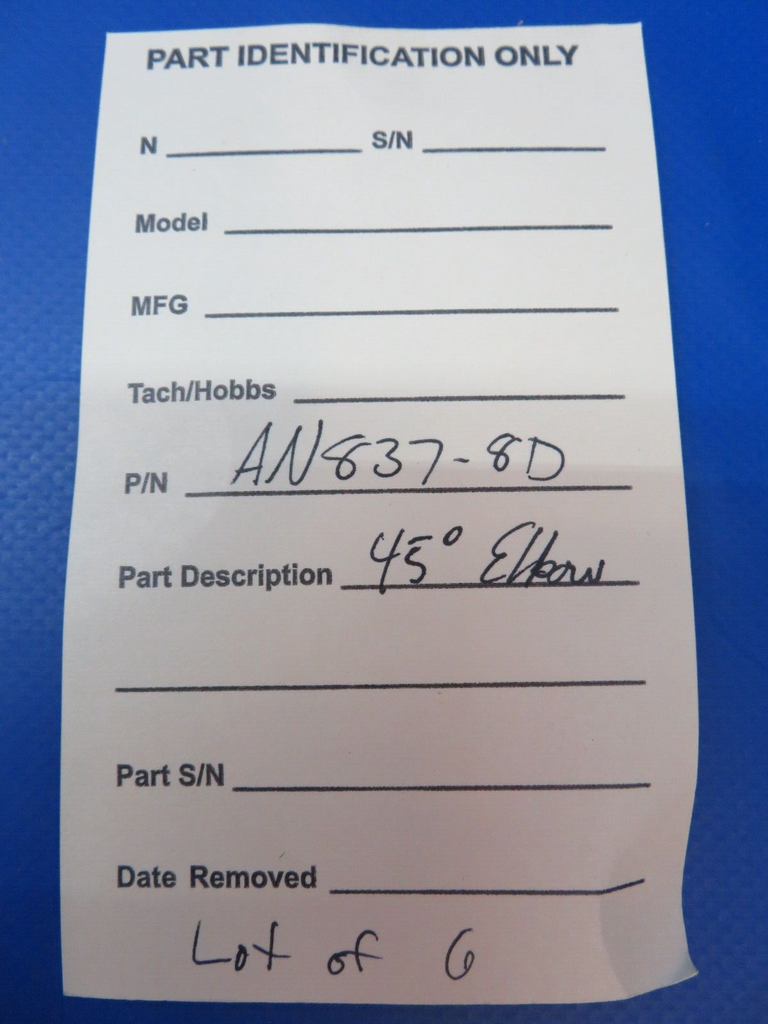 45 Degree Elbow. P/N AN837-8D. LOT OF 6. Guaranteed to pass inspection or your money back.