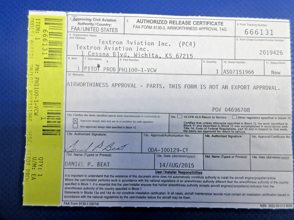 NEW OLD STOCK. With 8130 dated 08/14/2015. Guaranteed to pass inspection or your money back.