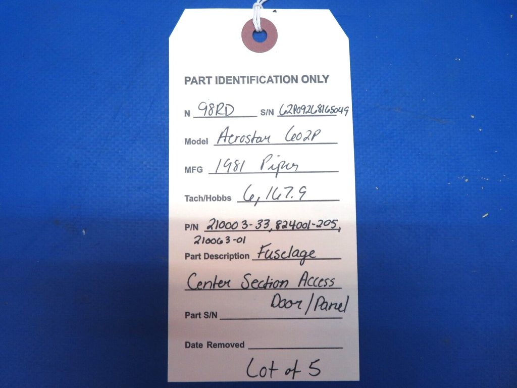 Piper Aerostar 602P Fuselage Center Section Access Door / Panel. P/N 210003-33, 824001-205, 210063-01. LOT OF 5. Removed in good condition from a parted out 1981 Piper Aerostar 602P N98RD, S/N 62P09268165049. TTAF 6,167.9. Guaranteed to pass inspection or your money back.