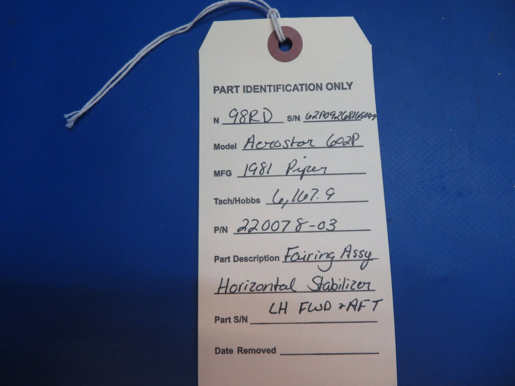 Piper Aerostar 602P Fairing Assembly Horizontal Stabilizer Left Hand: Forward, AFT, Upper and Lower. P/N 220078-03. Removed in good condition from a parted out 1981 Piper Aerostar 602P N98RD, S/N 62P09268165049. TTAF 6,167.9. Guaranteed to pass inspection or your money back.