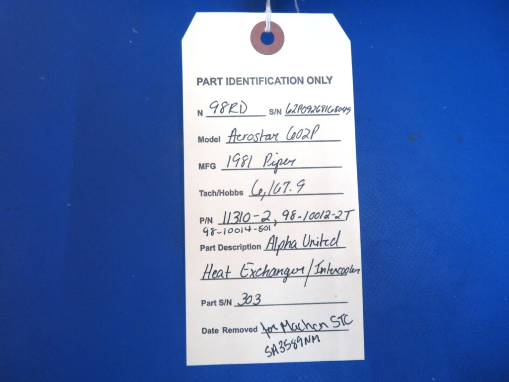 Piper Aerostar 602P Alpha United Heat Exchange / Intercooler. P/N 11310-2, 98-10012-2T, 98-10014-501. S/N 303. For Machen STC SA3589NM. Removed in good condition from a parted out 1981 Piper Aerostar 602P N98RD, S/N 62P09268165049. TTAF 6,167.9. Guaranteed to pass inspection or your money back.