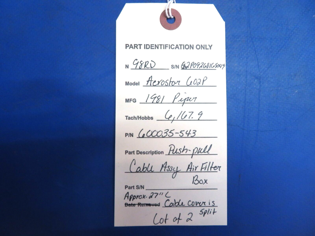 Piper Aerostar 602P Push-Pull Cable Air Filter Box. P/N 600035-543. LOT OF 2. Approx. 27" in Length. Cable cover is split. Removed in good condition from a parted out 1981 Piper Aerostar 602P N98RD, S/N 62P09268165049. TTAF 6,167.9. Guaranteed to pass inspection or your money back.