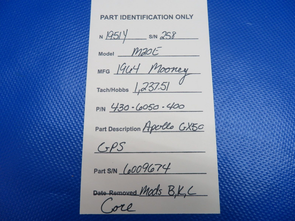 Apollo GX50 GPS. P/N 430-6050-400. S/N 6009674. Mods. B, K, L. CORE. Removed from a parted out 1964 Mooney M20E N1951Y, S/N 258. TTAF 1,237.51.