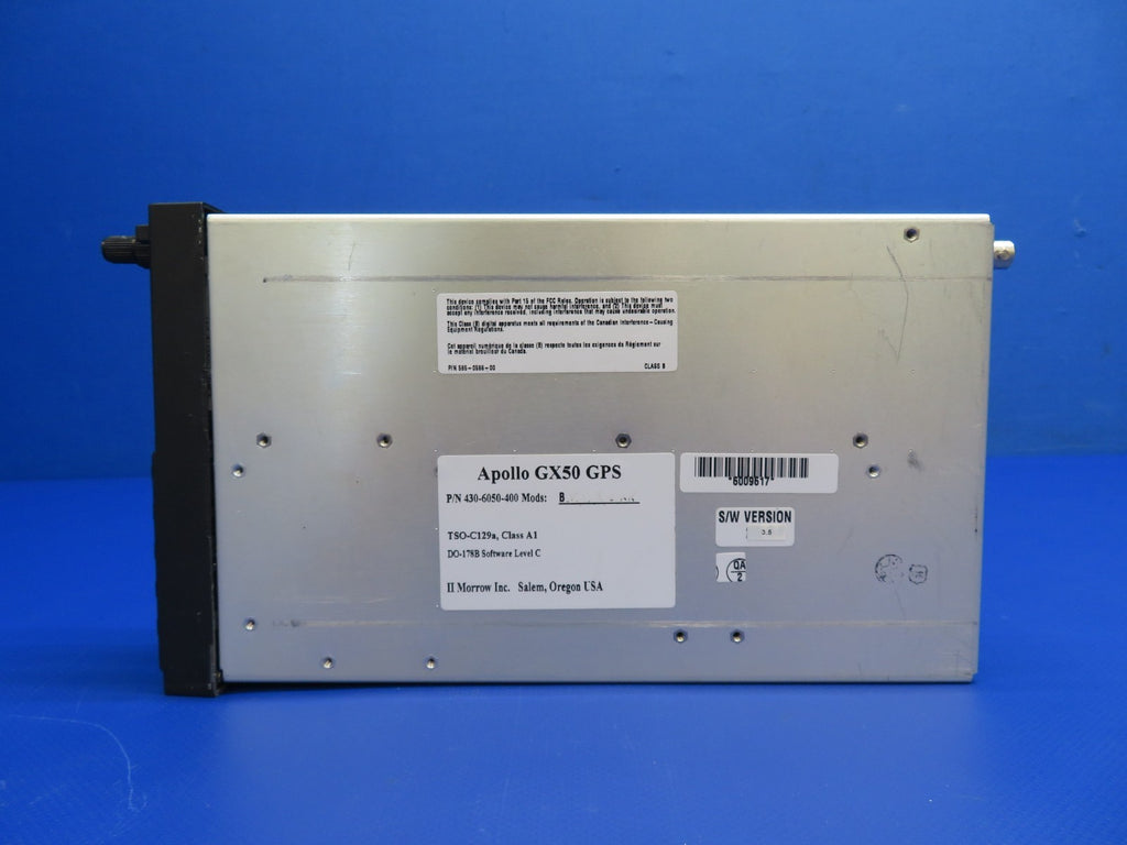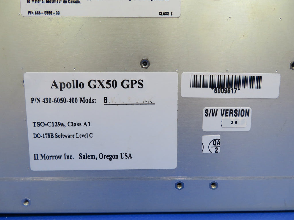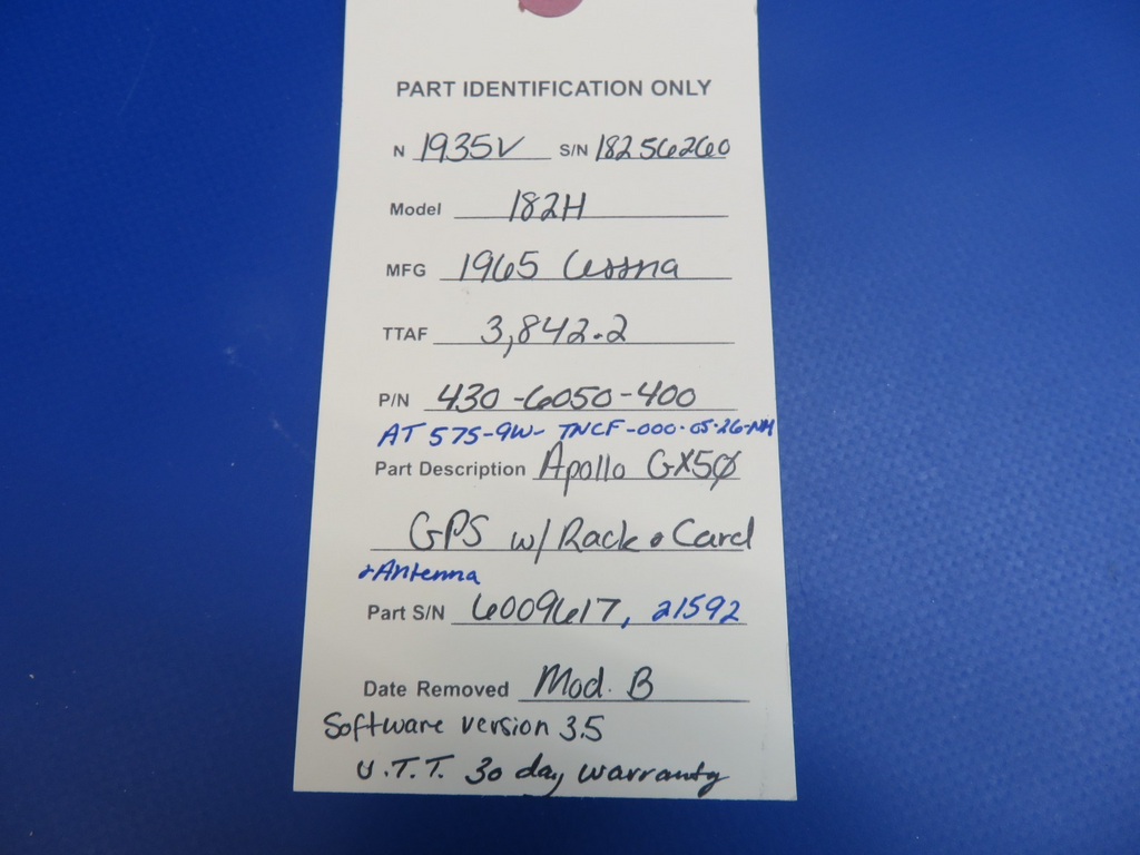 Apollo GX50 GPS with Rack, Card, and Antenna. GX50 P/N 430-6050-400. S/N 6009617. Mod. B. Software Version 3.5. Antenna P/N AT575-9W-TNCF-000-05-26-NM. S/N 21592. We are unable to test this unit, however, we are selling this unit with a 30 day warranty. Removed in good condition from a 1965 Cessna 182H N1935V, S/N 18256260. TTAF 3,842.2. Guaranteed to pass inspection or your money back.