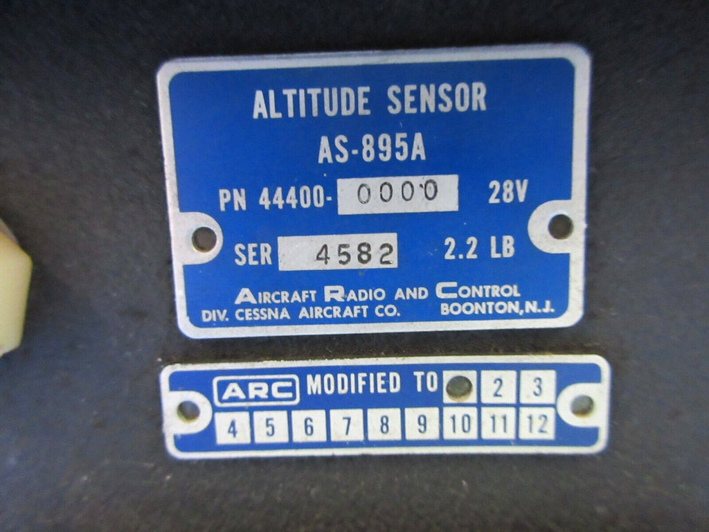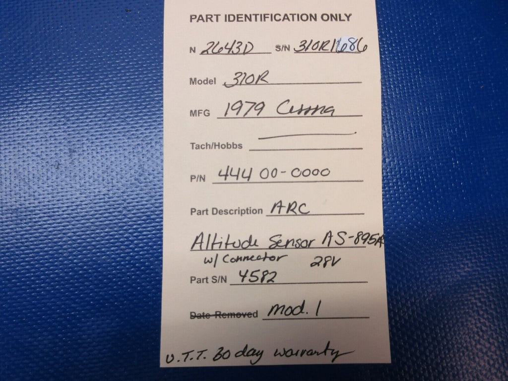 Cessna 310 / 310R ARC Altitude Sensor AS-895A with Connector 28 volts. P/N 44400-000. S/N 4582. Mod 1. We are unable to test this unit, however, we are selling this unit with a 30 day warranty. Removed in good condition from a parted out 1979 Cessna 310R N2643D, S/N 310R1686. Guaranteed to pass inspection or your money back.