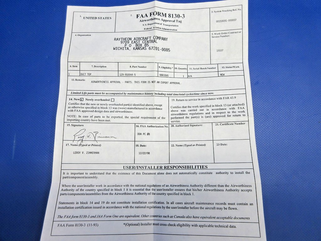Beech 1900D Airliner Air Inlet Duct Top With 8130. P/N 129-910044-5. NEW OLD STOCK. Guaranteed to pass inspection or your money back.