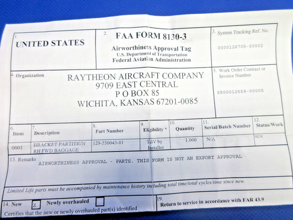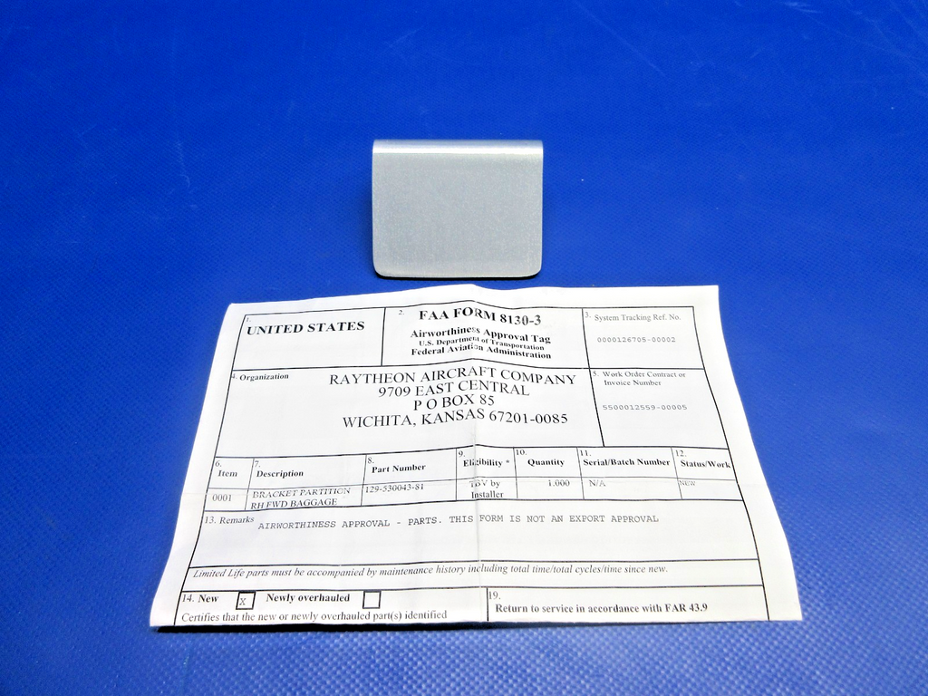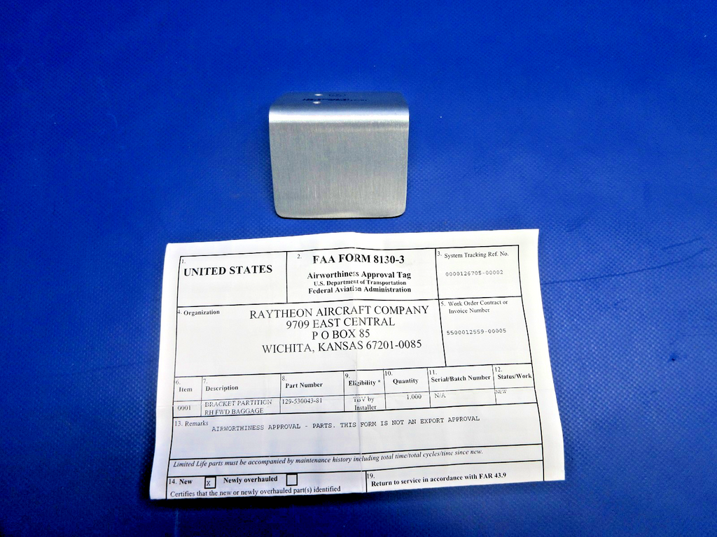 Beech 1900D Airliner Right Hand Forward Baggage Partition Bracket With 8130 P/N 129-530043-81. NEW OLD STOCK. Due to multiple quantities buyer may not receive exact item pictured. Guaranteed to pass inspection or your money back.