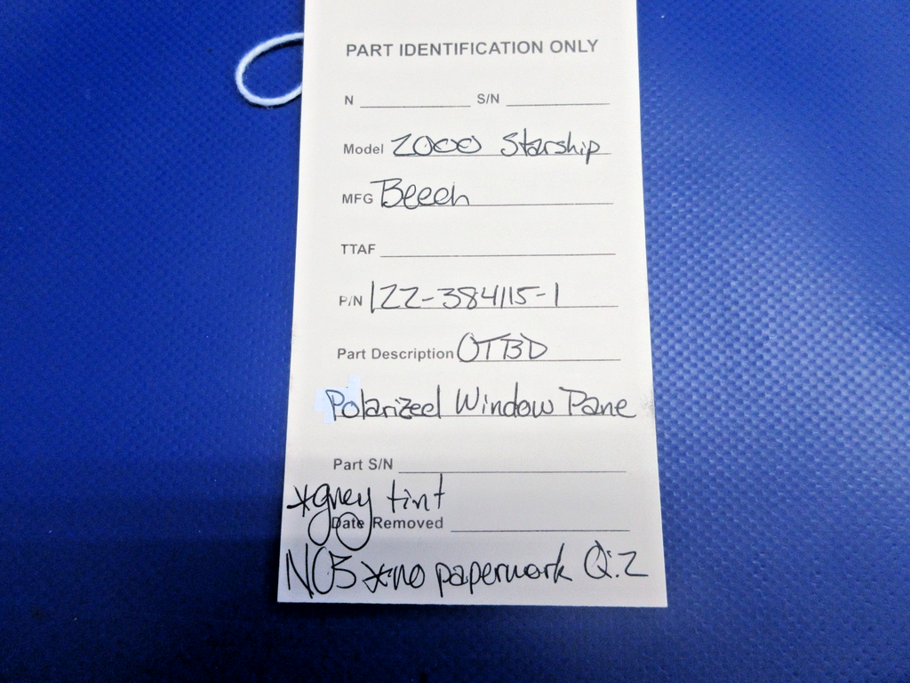 Beech 2000 Starship Outboard Polarized Window Pane. P/N 122-384115-1. NEW OLD STOCK. Grey Tint. No Paperwork. Due to multiple quantities buyer may not receive exact item pictured. Guaranteed to pass inspection or your money back.