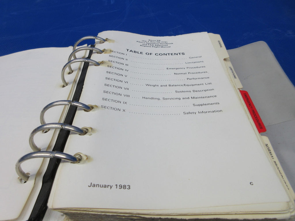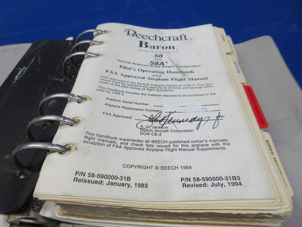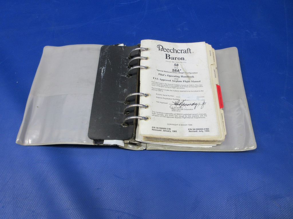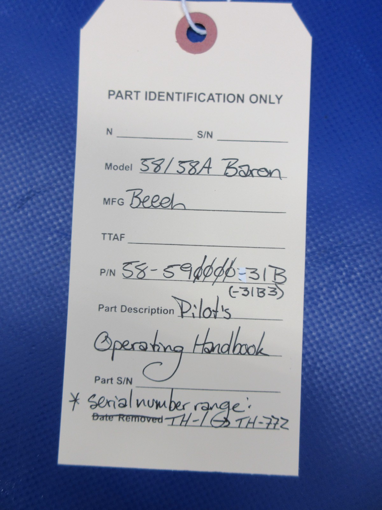 Beech 58 / 58A Baron Pilot's Operating Handbook. P/N 58-590000-31B, 58-590000-31B3. Serial Number Range: TH-1 > TH-772. Removed in good condition from a parted out 1971 Beech 58 Baron N4JD, S/N TH-145. TTAF 8,594.7. Guaranteed to pass inspection or your money back.