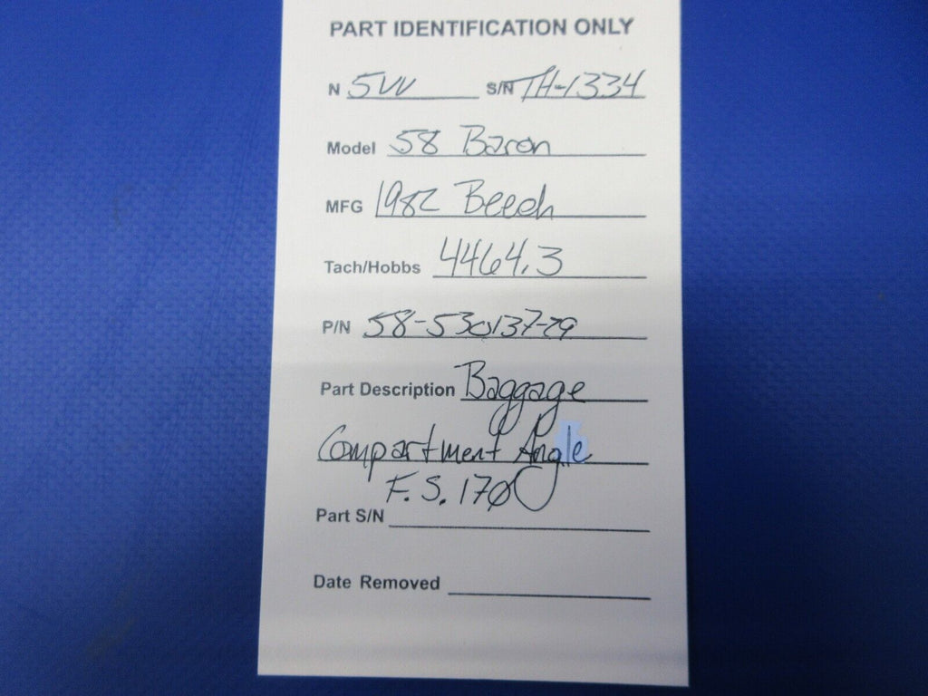 Beech 58 Baron Baggage Compartment Angle F.S.170. P/N 58-530137-29. Removed in good condition from a parted out 1982 Beech 58 Baron N5VV, S/N TH-1334. Aircraft TT4464.3 hours. Guaranteed to pass inspection or your money back.