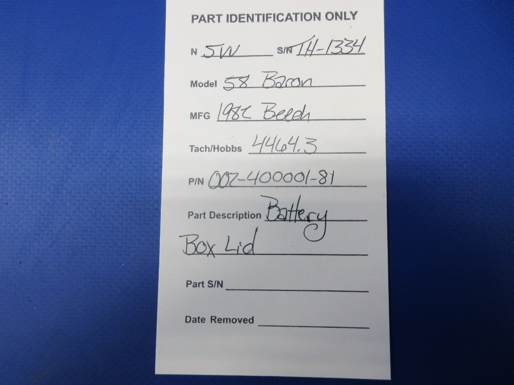Beech 58 Baron Battery Box Lid. P/N 002-400001-81. Removed in good condition from a parted out 1982 Beech 58 Baron N5VV, S/N TH-1334. Aircraft TT 4464.3 hours. Guaranteed to pass inspection or your money back.
