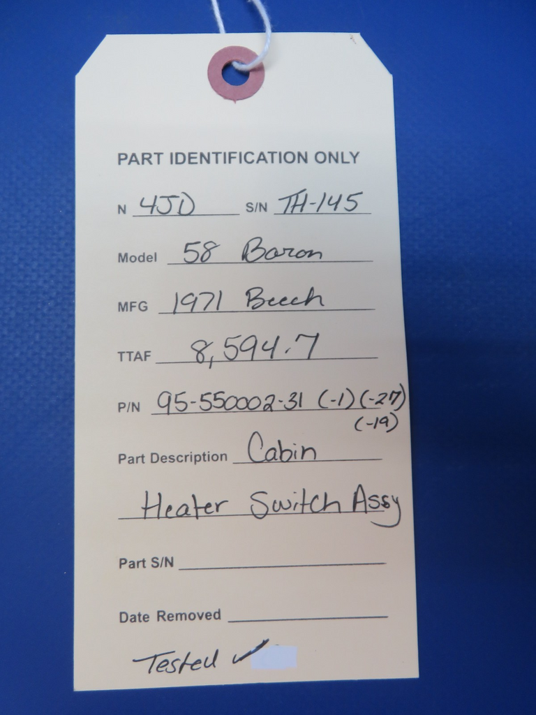 Beech 58 Baron Cabin Heater Switch Assembly. P/N 95-550002-31, 95-550002-1, 95-550002-27, 95-550002-19. This item was recently tested and found to be in working condition. Removed in good condition from a parted out 1971 Beech 58 Baron N4JD, S/N TH-145. TTAF 8,594.7. Guaranteed to pass inspection or your money back.