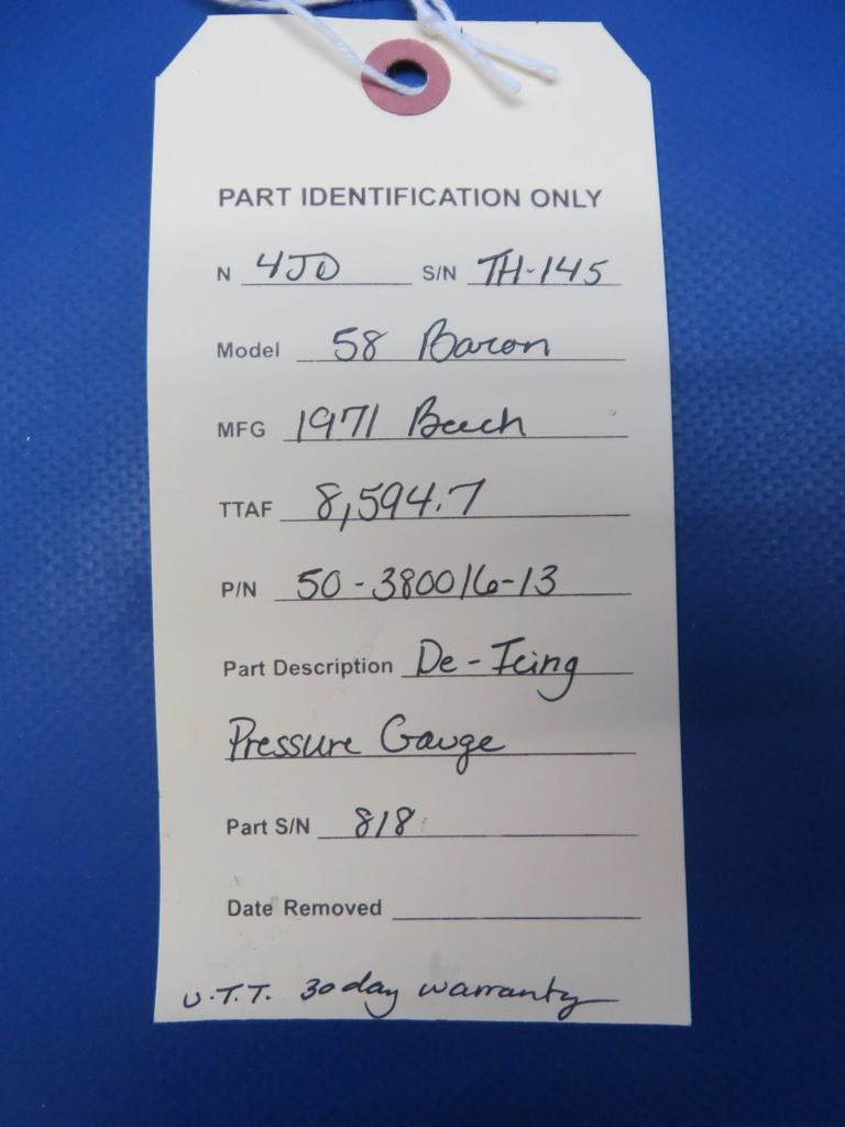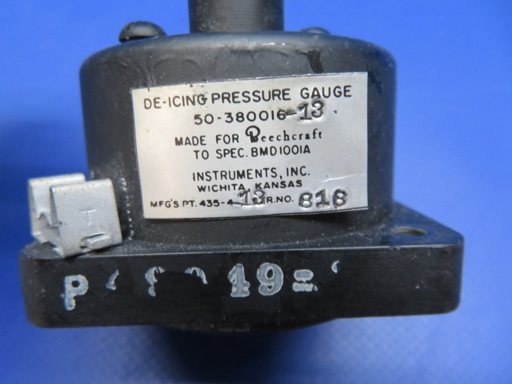 Beech 58 Baron De Icing Pressure Gauge. P/N 50-380016-13. S/N 818. We are unable to test this unit, however, we are selling this unit with a 30 day warranty. Removed in good condition from a parted out 1971 Beech 58 Baron N4JD, S/N TH-145. TTAF 8,594.7. Guaranteed to pass inspection or your money back.