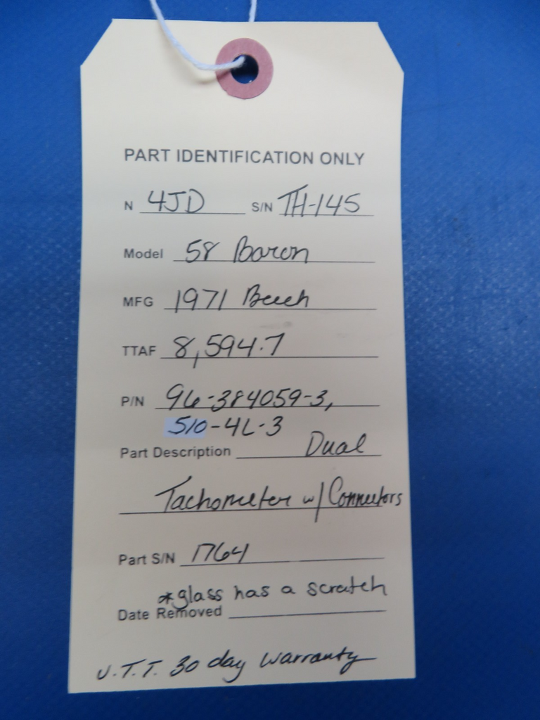 Beech 58 Baron Dual Tachometer w/ Connector P/N 96-384059-3 WARRANTY (0825-144)