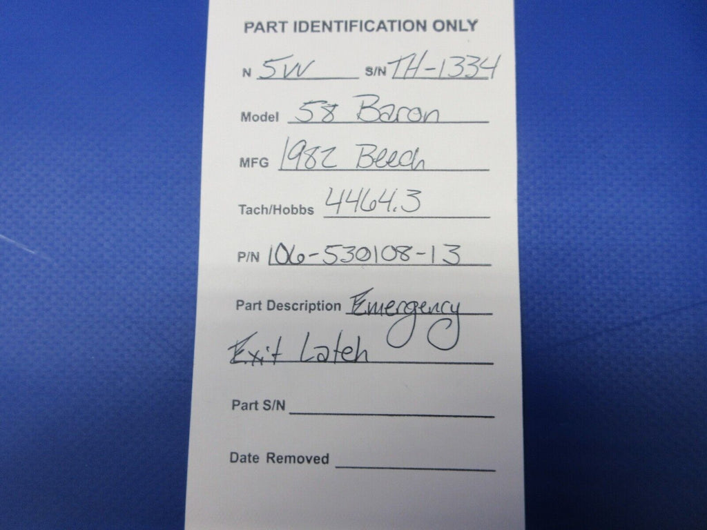 Beech 58 Baron Emergency Exit Latch. P/N 106-530108-13. Removed in good condition from a parted out 1982 Beech 58 Baron N5VV, S/N TH-1334. Aircraft TT4464.3 hours. Guaranteed to pass inspection or your money back.