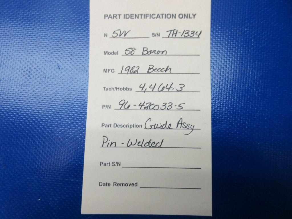 Beech 58 Baron Guide Assembly Pin - Welded. P/N 96-420033-5. Removed in good condition from a parted out 1982 Beech 58 Baron N5VV, S/N TH-1334. Aircraft TT4464.3 hours. Guaranteed to pass inspection or your money back.