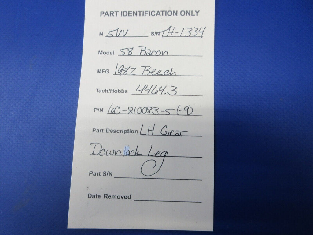 Beech 58 Baron Left Hand Gear Downlock Leg. P/N 60-810083-5, 60-810083-9. Removed in good condition from a parted out 1982 Beech 58 Baron N5VV, S/N TH-1334. Aircraft TT4464.3 hours. Guaranteed to pass inspection or your money back.