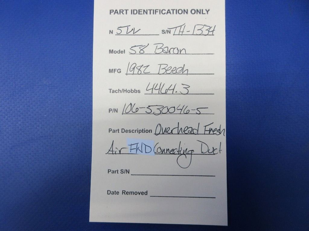 Beech 58 Baron Overhead Fresh Air Forward Connecting Duct. P/N 106-530046-5. Removed in good condition from a parted out 1982 Beech 58 Baron N5VV, S/N TH-1334. Aircraft TT4464.3 hours. Guaranteed to pass inspection or your money back.