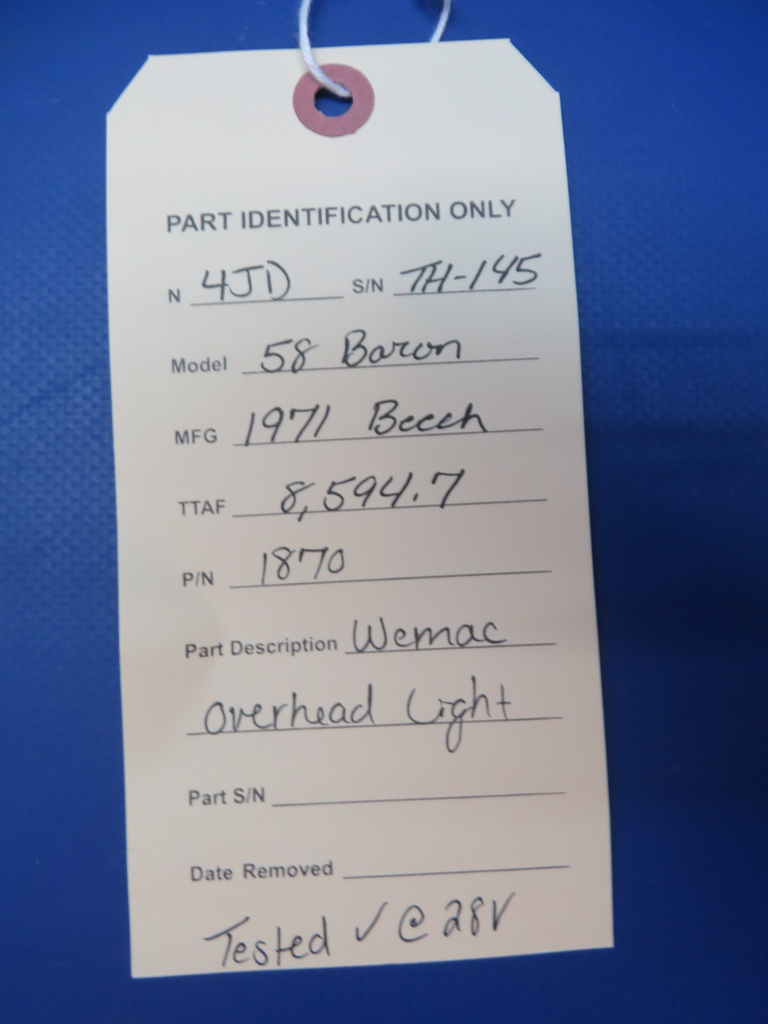 Beech 58 Baron Wemac Overhead Light. P/N 1870. This item was recently tested at 28v and found to be in working condition. Removed in good condition from a parted out 1971 Beech 58 Baron N4JD, S/N TH-145. TTAF 8,594.7. Guaranteed to pass inspection or your money back.