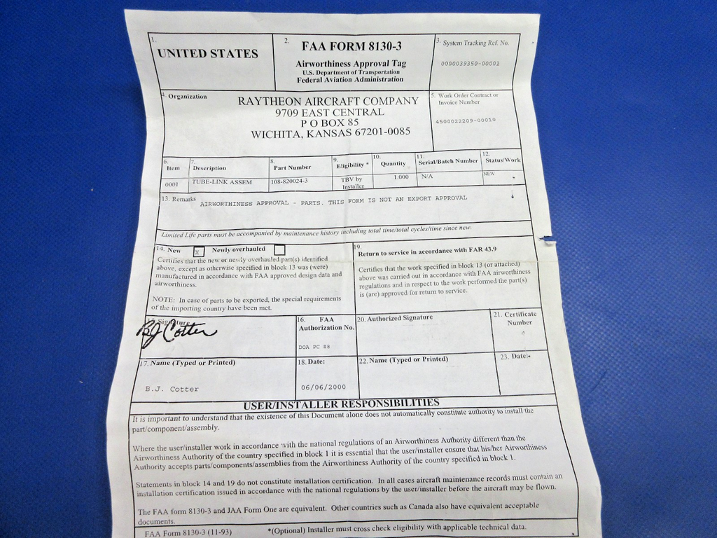 Beech 77 Skipper Nose Gear Steering Link Shaft With 8130. P/N 108-820024-3. NEW OLD STOCK. Guaranteed to pass inspection or your money back.