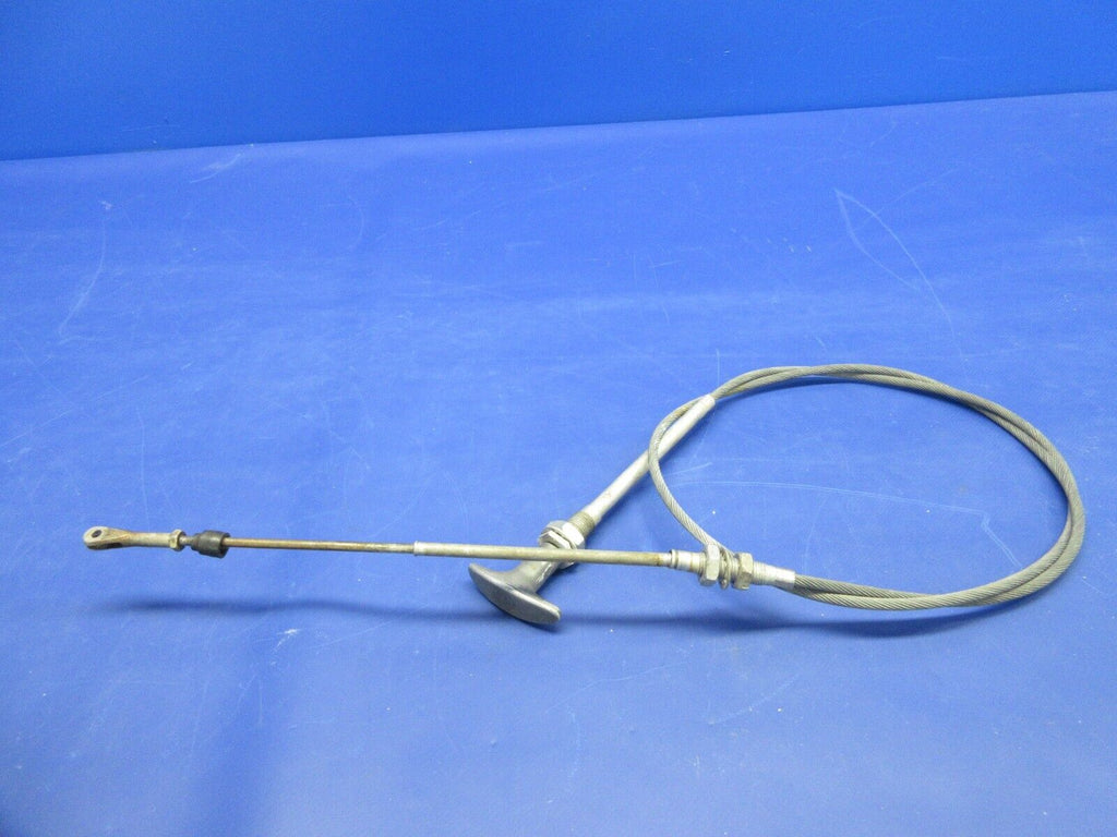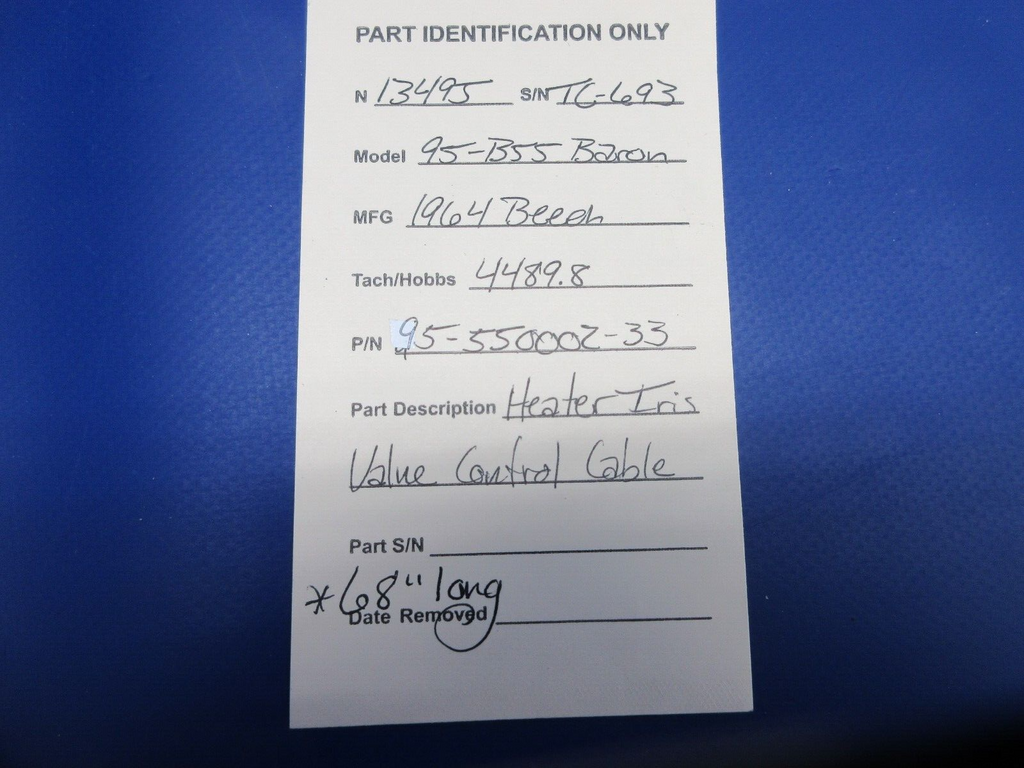 Beech 95-B55 Baron Heater Iris Valve Control Cable. P/N 95-550002-33. 68" Long. Removed in good condition from a parted out 1964 Beech 95-B55 Baron N1349J, S/N TC-693. TTAF 4,489.8. Guaranteed to pass inspection or your money back.