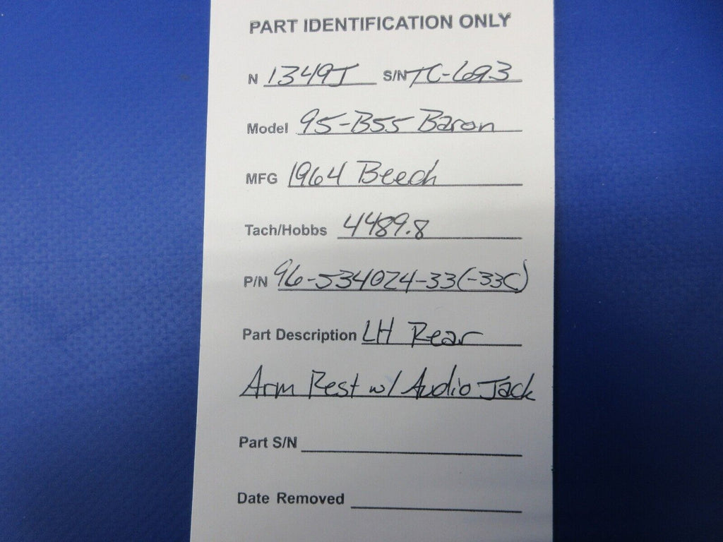 Beech 95-B55 Baron LH Rear Arm Rest w/ Audio Jack P/N 96-534024-33 (0225-1322)