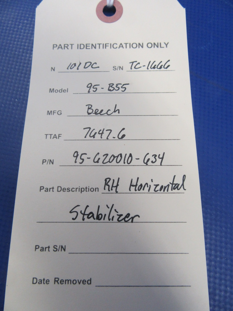 Beech 95-B55 Baron RH Horizontal Stabilizer P/N 95-620010-634. Minor dings, confined to underside (FOD.) Removed from parted-out 1974 Beech 95-B55 Baron N101DC, S/N TC-1666. Aircraft TT 7647.6. Guaranteed to pass inspection or your money back.