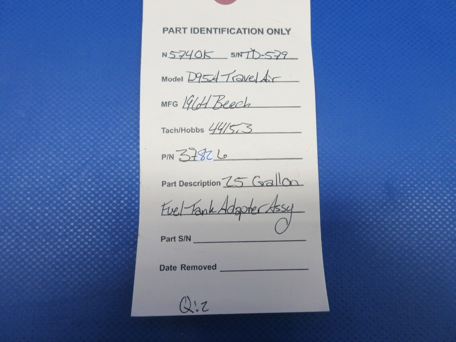 Beech 95 / D95A Travel Air 25 Gallon Fuel Tank Adapter Assembly. P/N 37826. Due to multiple quantities buyer may not receive exact item pictured. Guaranteed to pass inspection or your money back. Removed in good condition from a parted out 1964 Beech D95A Travel Air N5740K, S/N TD-579. TTAF 4,415.3. Guaranteed to pass inspection or your money back.