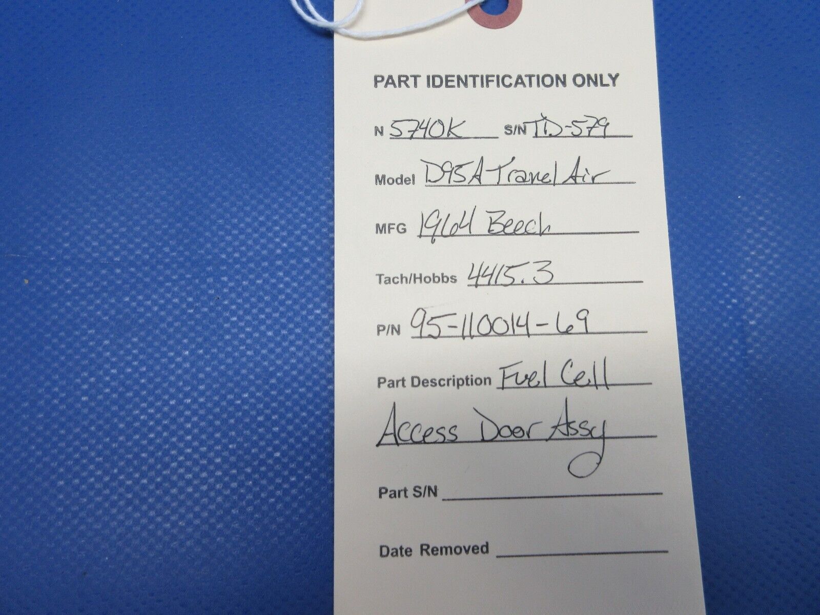 Beech 95 / D95A Travel Air Fuel Cell Access Door Assembly. P/N 95-110014-69. Guaranteed to pass inspection or your money back. Removed in good condition from a parted out 1964 Beech D95A Travel Air N5740K, S/N TD-579. TTAF 4,415.3. Guaranteed to pass inspection or your money back.