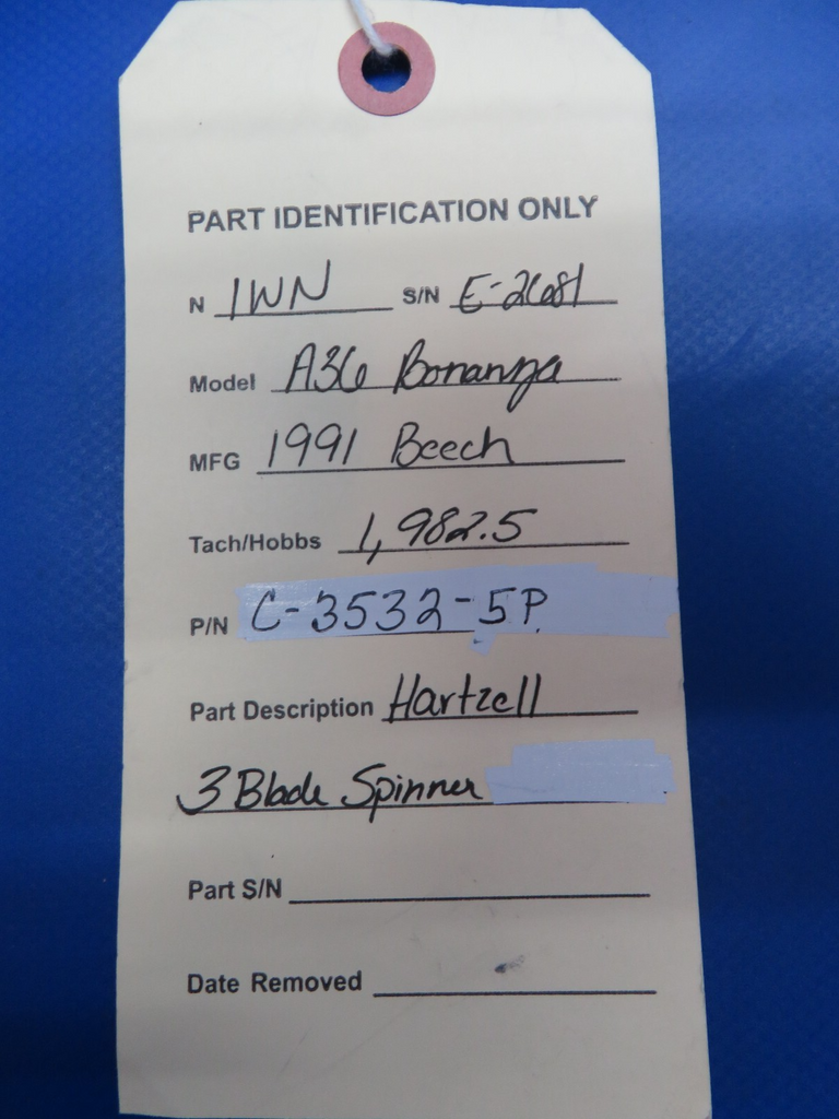 Beech A36 Bonanza Hartzell 3 Blade Spinner. P/N C-3532-5P. Removed in good condition from a parted out 1991 Beech A36 Bonanza, N1WN, S/N E-2681. Guaranteed to pass inspection or your money back.
