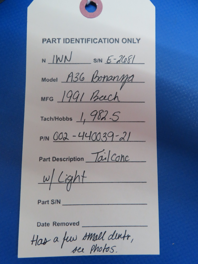 Beech A36 Bonanza Tailcone with Light. P/N 002-440039-21. Has a few small dents, see photos. Removed in good condition from a parted out 1991 Beech A36 Bonanza, N1WN, S/N E-2681. Guaranteed to pass inspection or your money back.