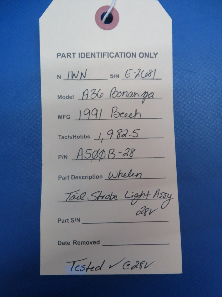 Beech A36 Bonanza Whelen Tail Strobe Light Assembly 28v. P/N A500B-28. This item was recently tested @ 28v and found to be in working condition. Removed in good condition from a parted out 1991 Beech A36 Bonanza, N1WN, S/N E-2681. Guaranteed to pass inspection or your money back.