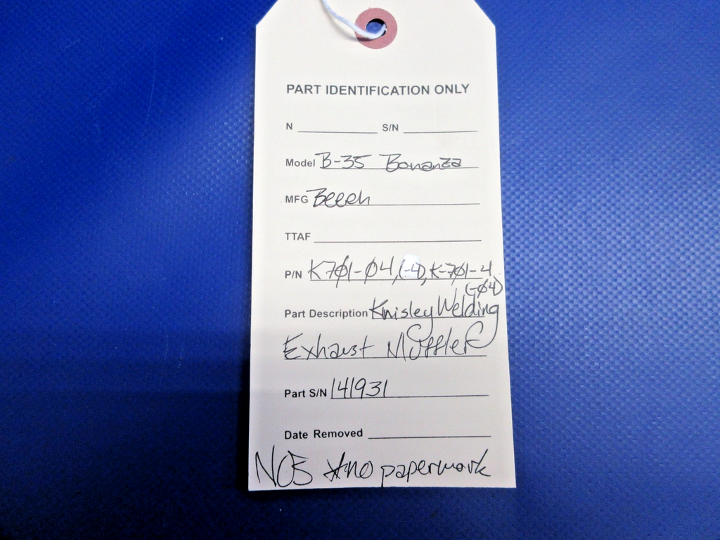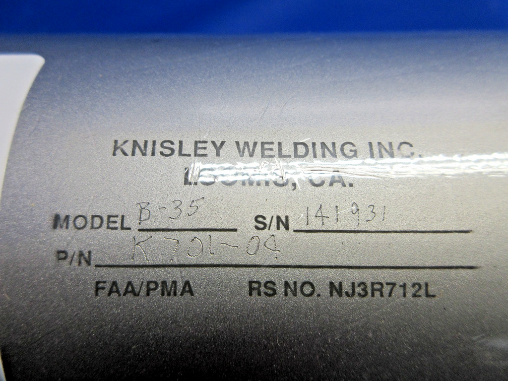 Beech B-35 Bonanza Knisley Welding Exhaust Muffler. P/N K701-04, K701-4, K-701-4, K-701-04. S/N 141931. NEW OLD STOCK. No Paperwork. Guaranteed to pass inspection or your money back.