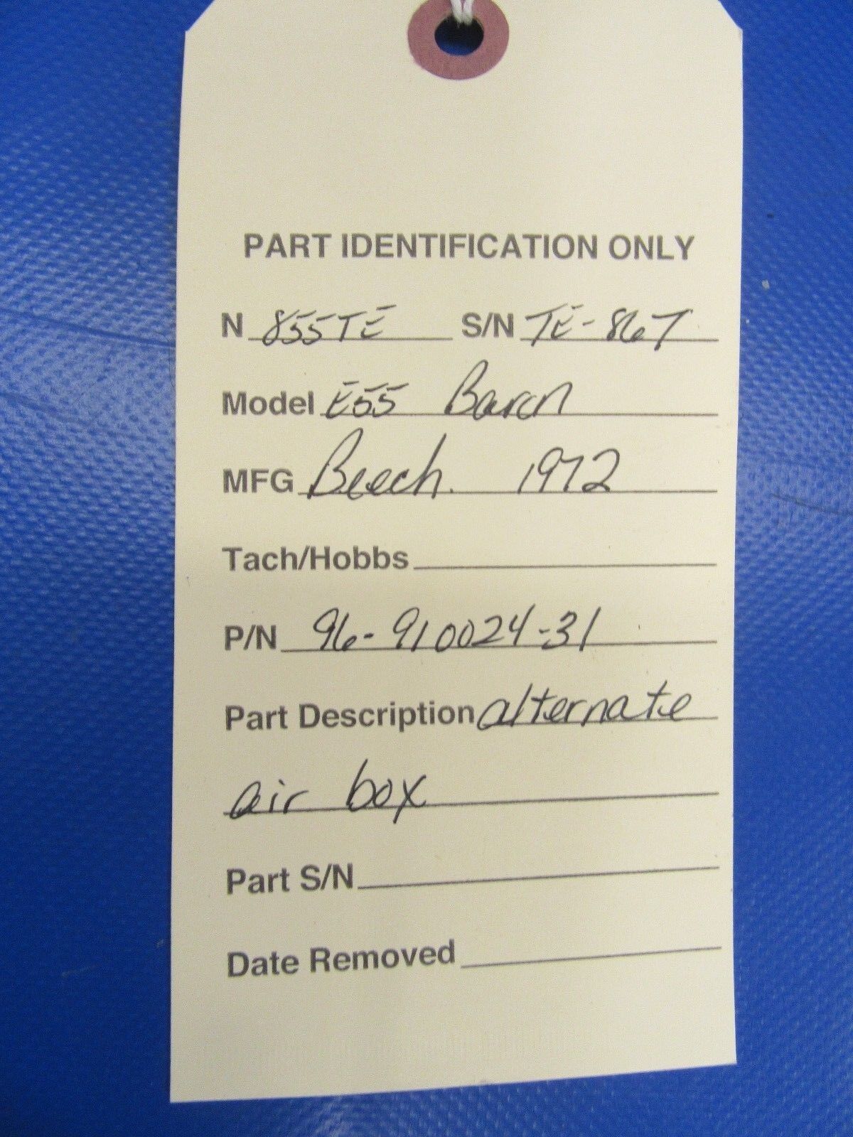 Beech Baron Alternate Air Box. P/N 96-910024-31. Removed in good condition from a parted out 1972 Beech Baron E55 N855TE, S/N TE-867. Guaranteed to pass inspection or your money back.