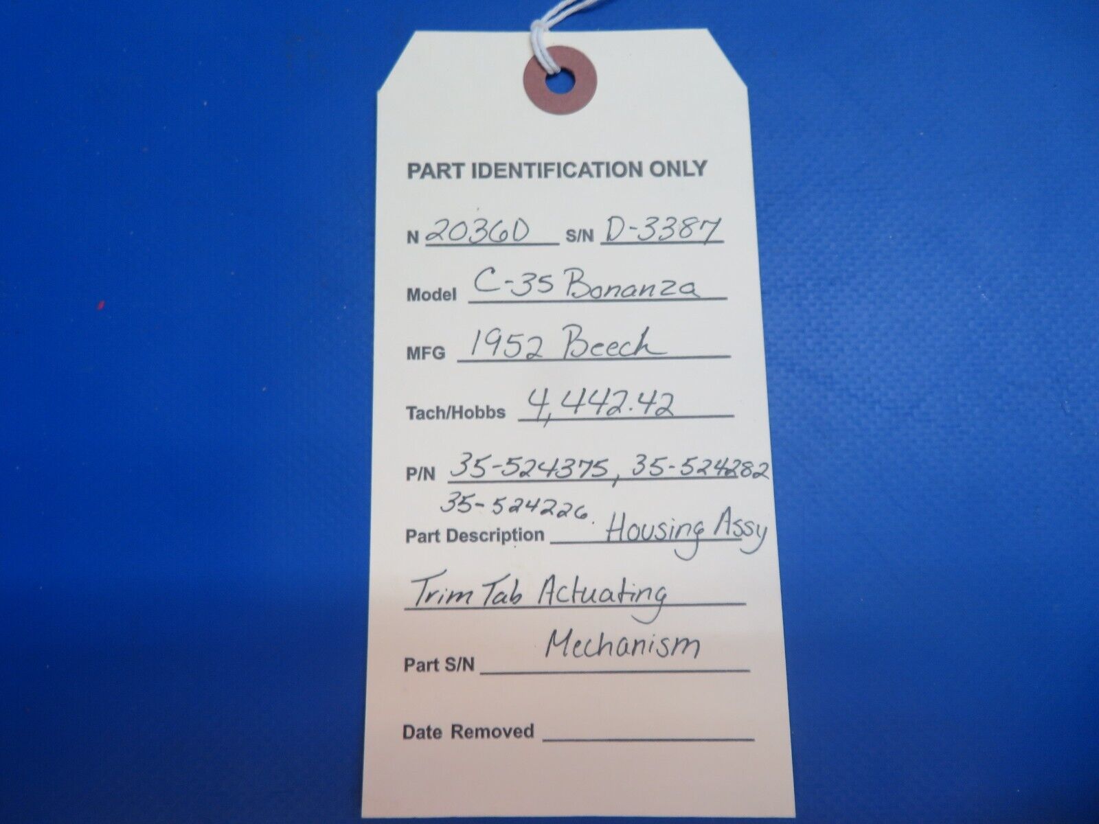 Beech C-35 Bonanza Housing Assembly Trim Tab Actuating Mechanism. P/N 35-524375, 35-524282, 35-524226. Removed in good condition from a parted out 1952 Beech C35 Bonanza, N2036D, S/N D-3387. TTAF 4,442.42. Guaranteed to pass inspection or your money back.