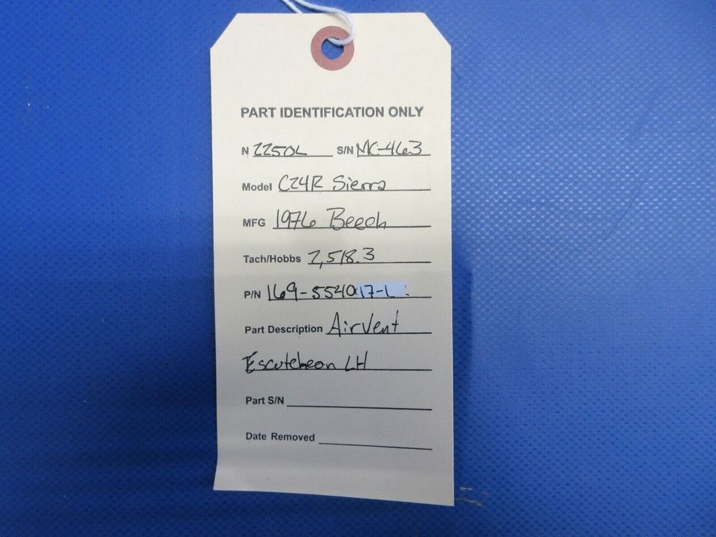 Air Vent Escutcheon Left Hand. P/N 169-554017-1. Removed in good condition from a parted out Beech C24R Sierra N2250L, S/N MC-463. TTAF 2,518.3. Guaranteed to pass inspection or your money back.