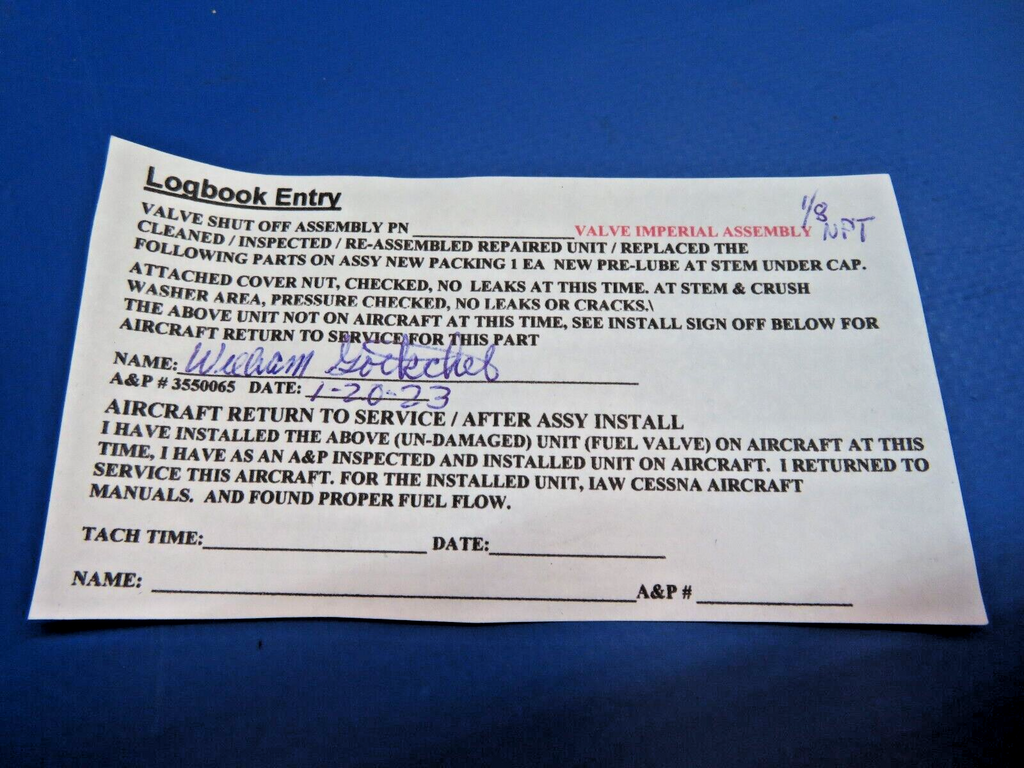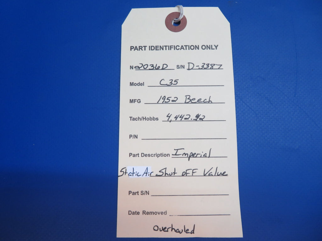 Beech C35 Bonanza Imperial Static Air Shut Off Valve. 1/8 NPT. REBUILT. Removed in good condition from a parted out 1952 Beech C35 Bonanza, N2036D, S/N D-3387. TTAF 4,442.42. Guaranteed to pass inspection or your money back.