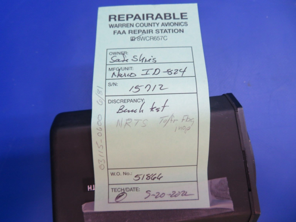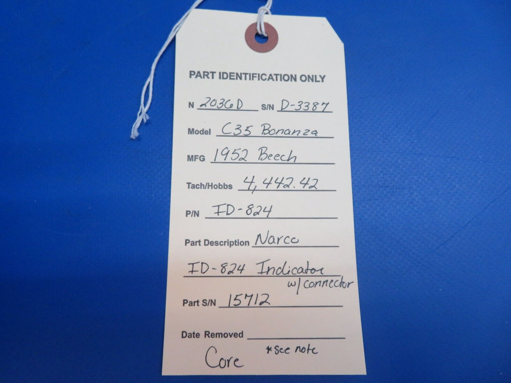 Beech C35 Bonanza Narco ID-824 Indicator with Connector. P/N ID-824. S/N 15712. Removed from a parted out 1952 Beech C35 Bonanza N2036D, S/N D-3387. TTAF 4,442.42. CORE.
