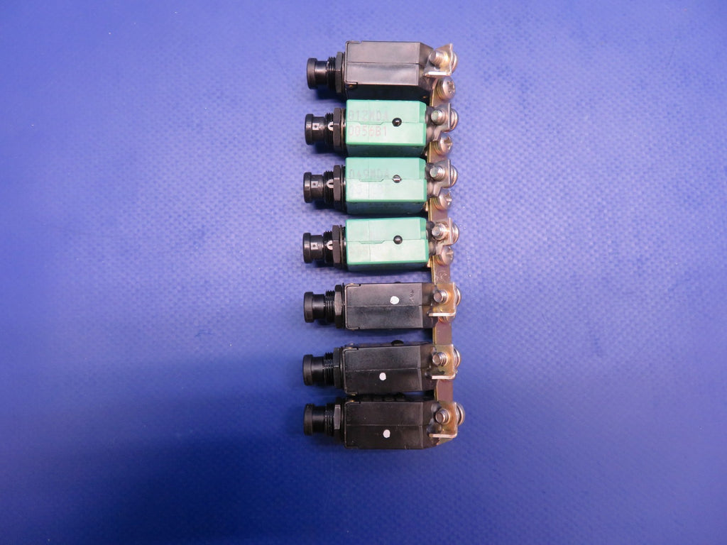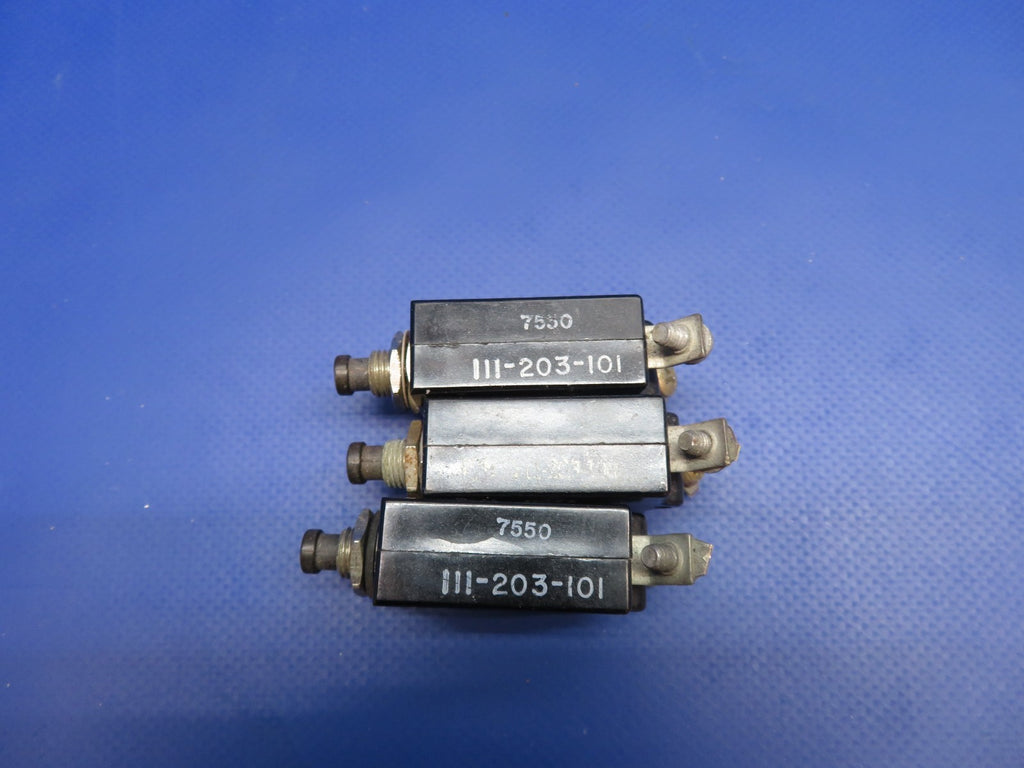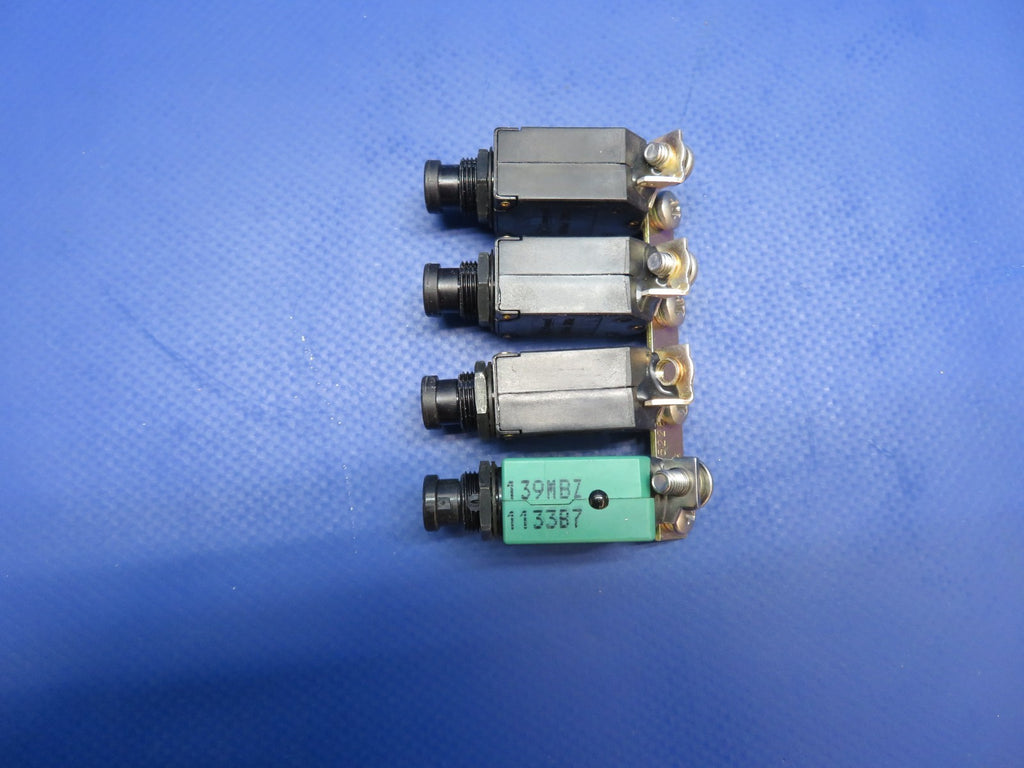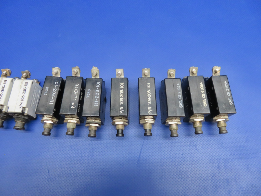 Beech D95A Travel Air Circuit Breakers. LOT OF 23. Amps: 1, 2, 3, 5, 7-1/2, 50. Removed in good condition from a parted out 1965 Beech D95A Travel Air N5856S, S/N TD-632 TTAF 6,593.4. Guaranteed to pass inspection or your money back.