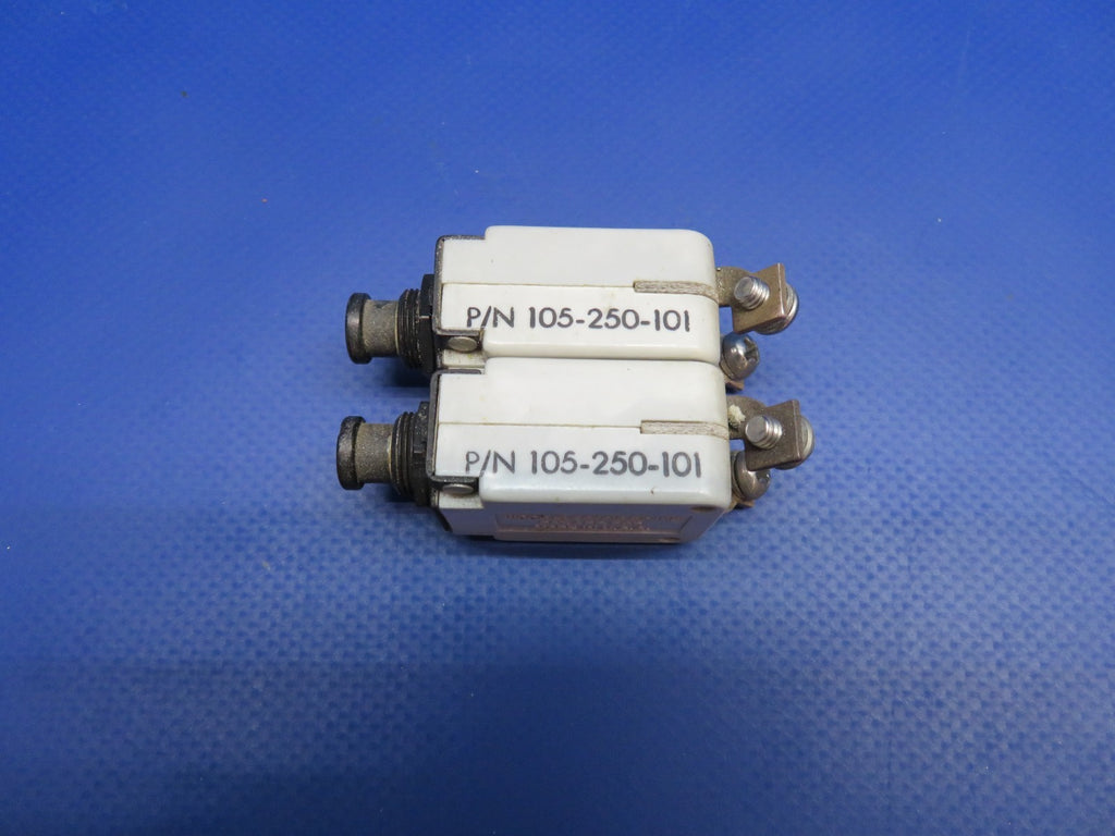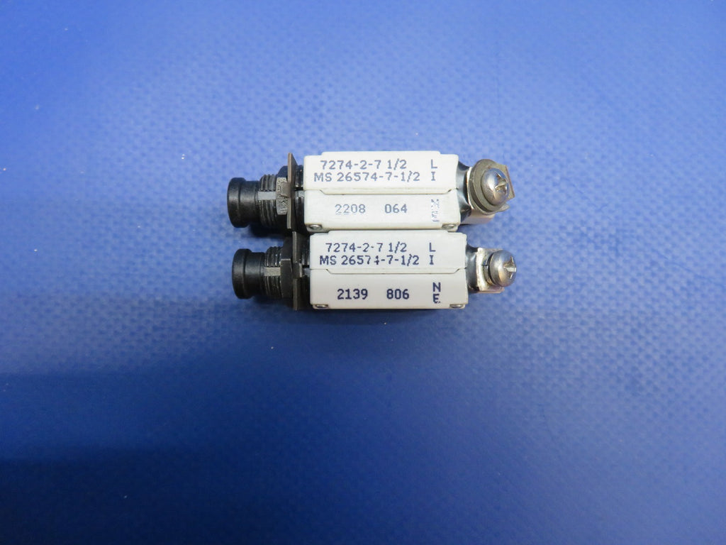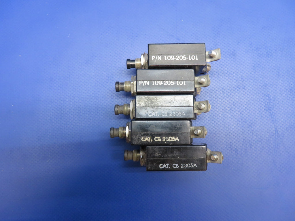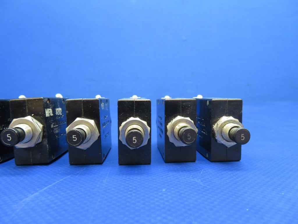 Beech D95A Travel Air Circuit Breakers. LOT OF 23. Amps: 1, 2, 3, 5, 7-1/2, 50. Removed in good condition from a parted out 1965 Beech D95A Travel Air N5856S, S/N TD-632 TTAF 6,593.4. Guaranteed to pass inspection or your money back.