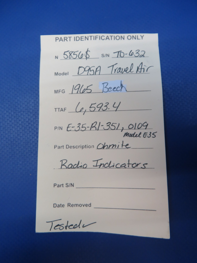 Beech D95A Travel Air Ohmite Model E35 Radio Indicator. P/N E-35-R1-351, 0109. This item was recently tested and found to be in working condition. Removed in good condition from a parted out 1965 Beech D95A Travel Air N5856S, S/N TD-632 TTAF 6,593.4. Guaranteed to pass inspection or your money back.