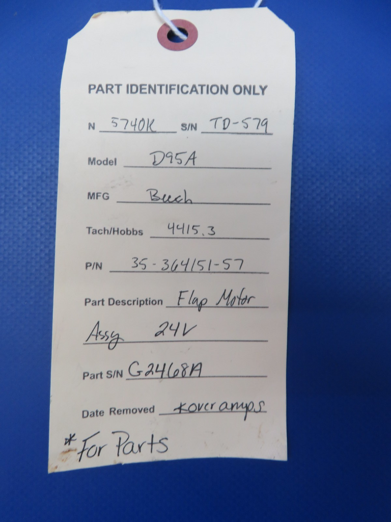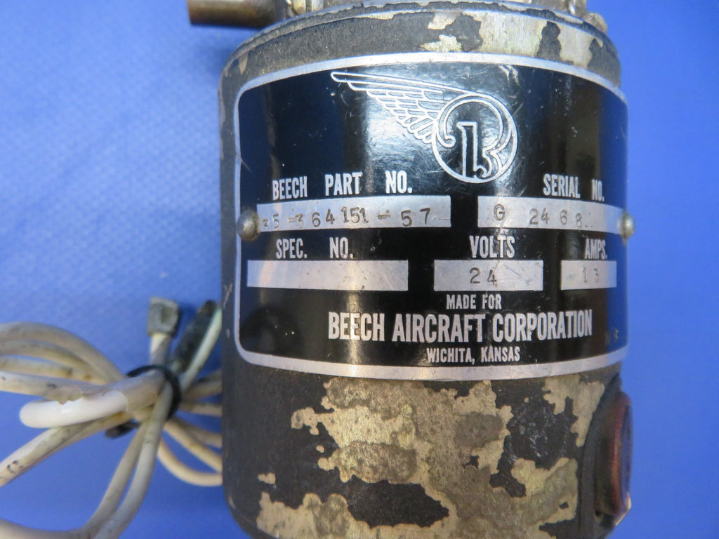 Beech D95A Travel Air Flap Motor Assembly 24v. P/N 35-364151-57. S/N G2468A. FOR PARTS. Bench test and it's drawing too many Amps. Removed from a parted out 1964 Breech D95A Travel Air N5740K, S/N TD-579. TTAF 4,415.3.