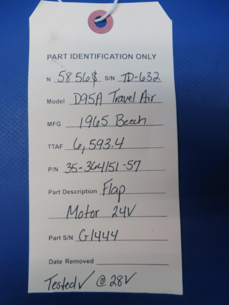Beech D95A Travel Air Flap Motor 24v. P/N 35-364151-57. S/N G1444. This item was recently tested at 28v and found to be in working condition. Removed in good condition from a parted out 1965 Beech D95A Travel Air N5856S, S/N TD-632 TTAF 6,593.4. Guaranteed to pass inspection or your money back.