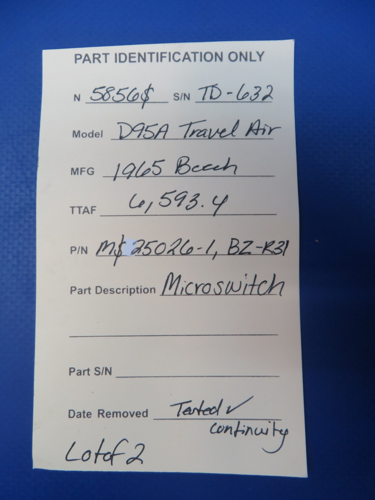 Beech D95A Travel Air Microswitch. P/N MS25026-1, BZ-R31. LOT OF 2. This item was recently continuity tested and found to be on working condition. Removed in good condition from a parted out 1965 Beech D95A Travel Air N5856S, S/N TD-632 TTAF 6,593.4. Guaranteed to pass inspection or your money back.