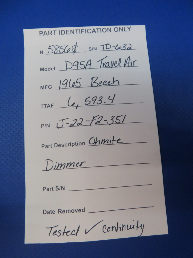 Beech D95A Travel Air Ohmite Dimmer. P/N J-22-F2-351. This item was recently continuity tested and found to be on working condition. Removed in good condition from a parted out 1965 Beech D95A Travel Air N5856S, S/N TD-632 TTAF 6,593.4. Guaranteed to pass inspection or your money back.